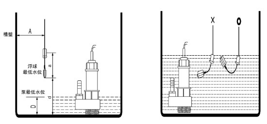 2、浮球動(dòng)作長(zhǎng)度a須***小于槽壁與電纜距離A,浮球控制***低水位d須***大于水位D。 見圖:
