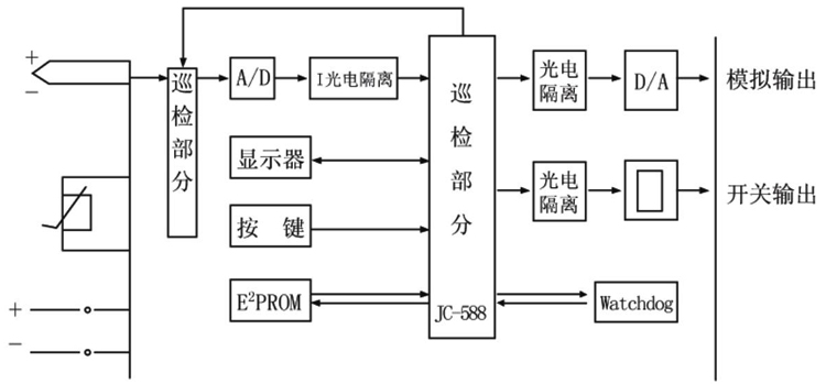 ZW-XMDA系列智能巡回顯示調(diào)節(jié)儀是由巡回測量回路,數(shù)字面板表、調(diào)節(jié)器和電源部分組成。穩(wěn)壓電源將220V市電轉(zhuǎn)換成穩(wěn)定的直流電壓作為其它部分電源。巡回測量回路則是將被測回路中的一路選定后送給A/D轉(zhuǎn)換后輸送到JC-588專用中央處理器進行處理后,不僅要送到數(shù)字面板表,而且也要送到調(diào)節(jié)器,與設定值比較后按調(diào)節(jié)規(guī)律輸出控制或報警信號。